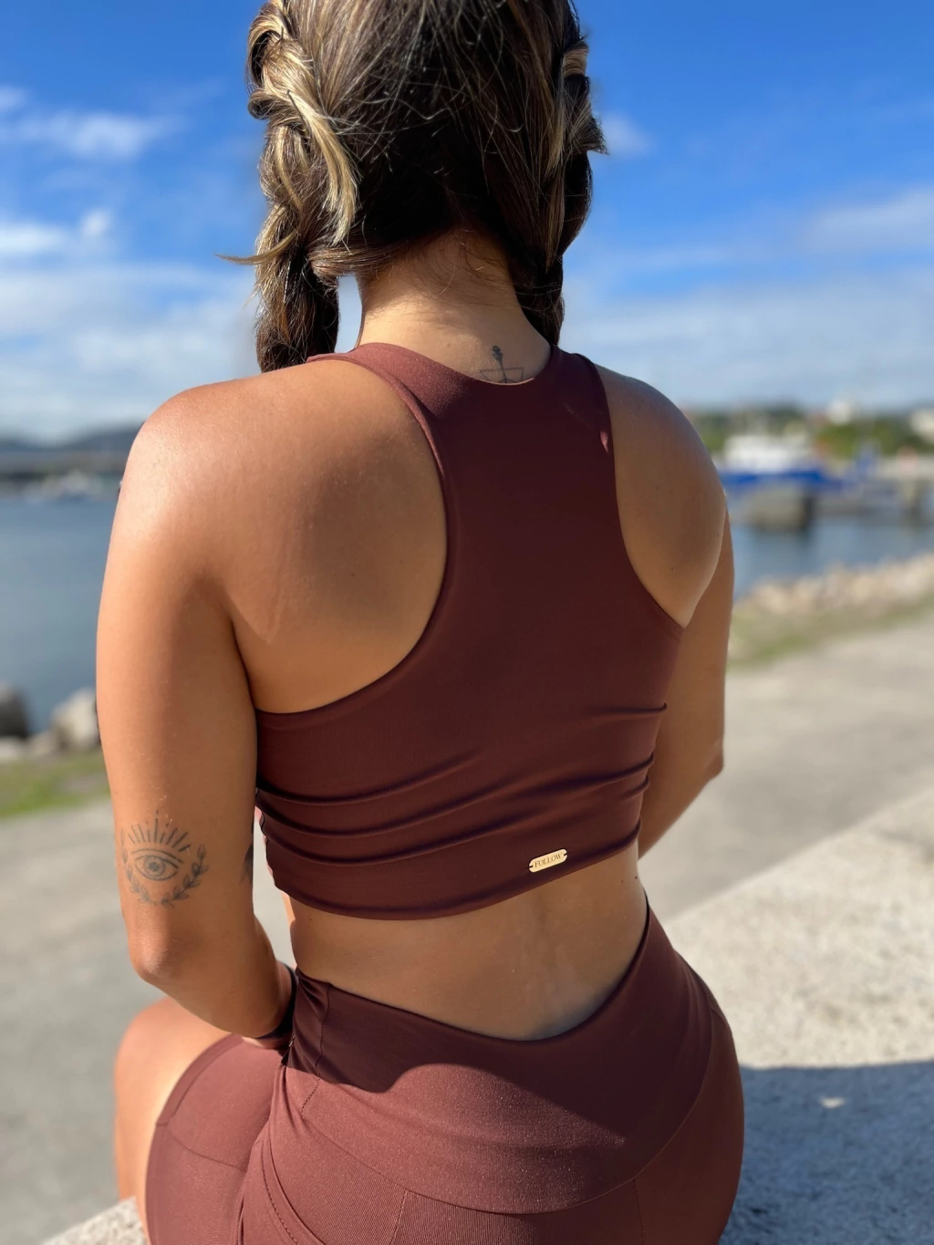 O decote alto na frente traz um visual moderno e sofisticado, enquanto o decote nadador nas costas oferece mais estabilidade e sustentação, mantendo tudo no lugar até nos treinos mais intensos.